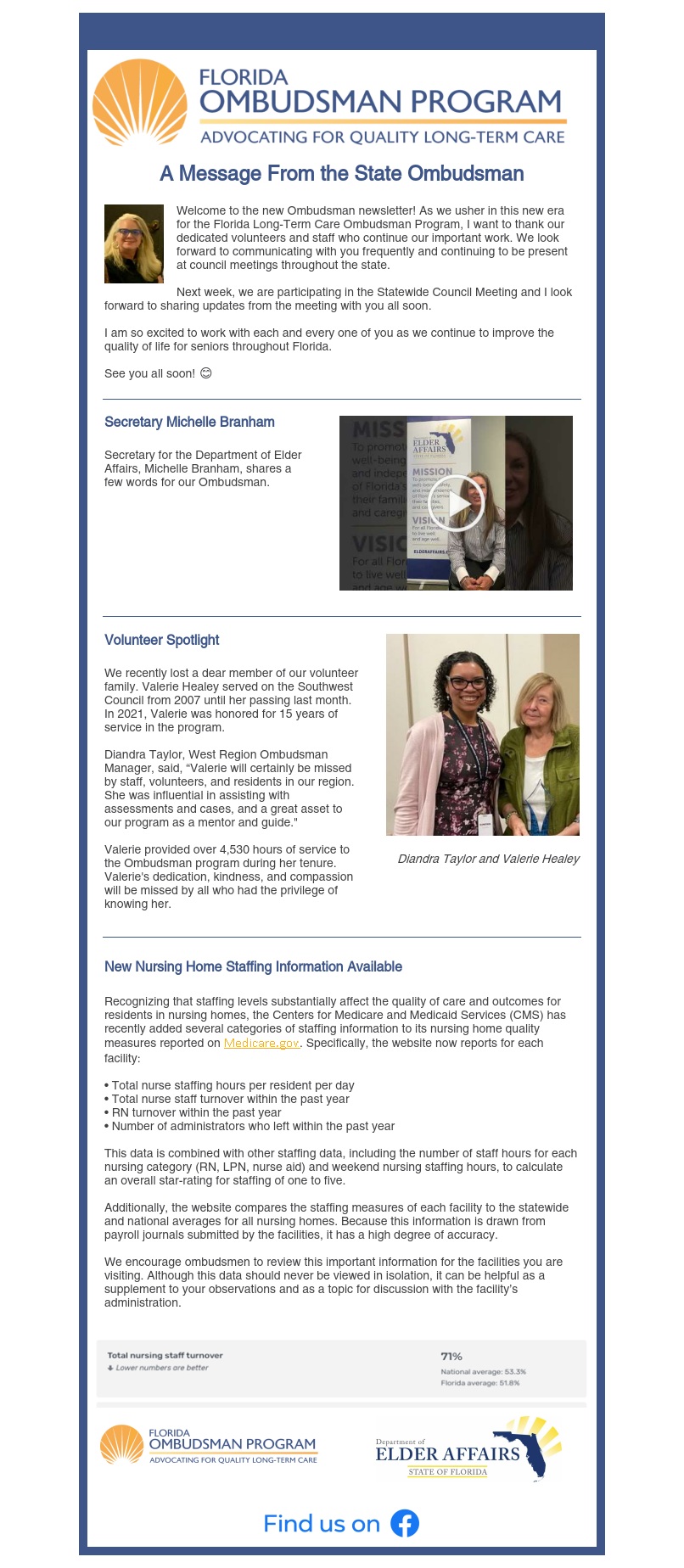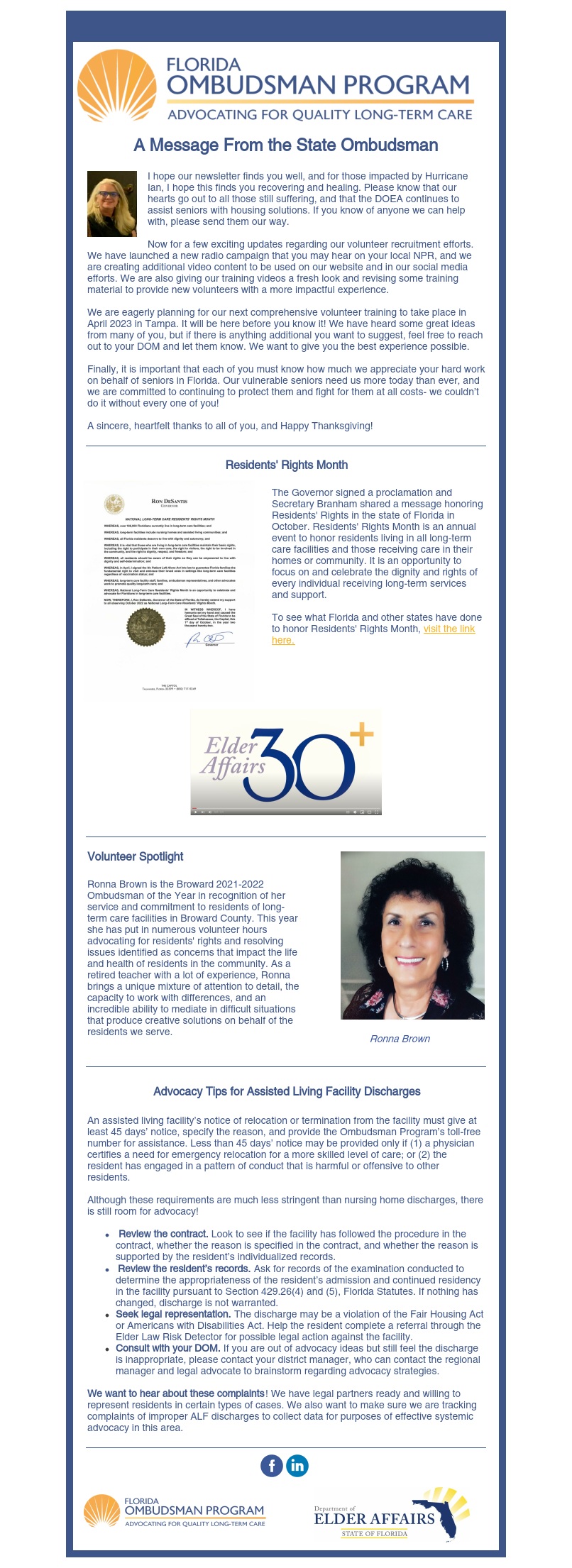 Join our team!! You can be trained and certified as a State of Florida Long-Term Care Ombudsman and make a difference in people’s lives in nursing homes, assisted living facilities, and adult family care homes. In addition to having the satisfaction of knowing that you are improving the care of long-term care residents, you will have the opportunity to make new friends and increase your understanding of aging and the aging process.