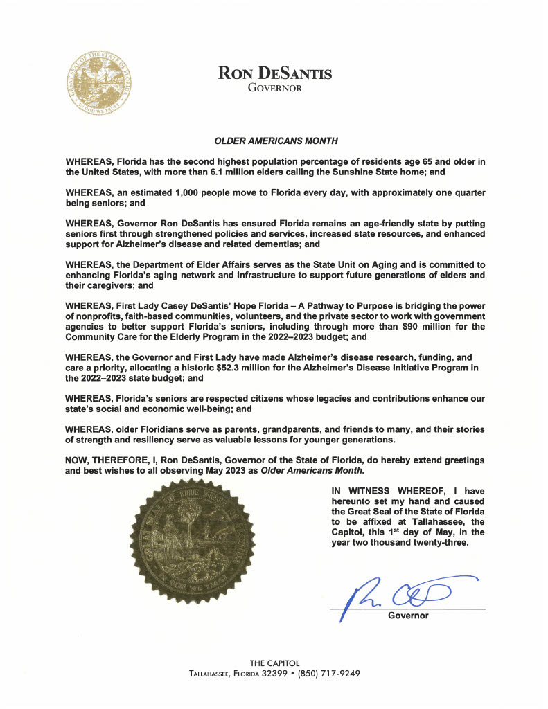 Governor DeSantis Proclaims May as Older Americans Month May 18, 2023 | Press Releases For Immediate Release: May 18, 2023Â CONTACT: DOEA Communications communications@elderaffairs.orgÂ