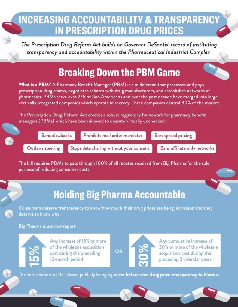 “This legislation builds a foundation of transparency for pharmacy benefit manager (PBM) practices and drug prices in Florida, allowing consumers to make the best choices for their own health,” said Governor Ron DeSantis. “PBMs and Big Pharma have managed to escape the public eye and work in the shadows for far too long. I’m proud to sign a bill that takes the reins back from these health care monopolies while empowering consumers.”